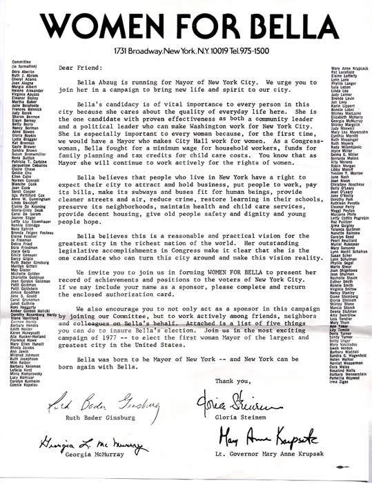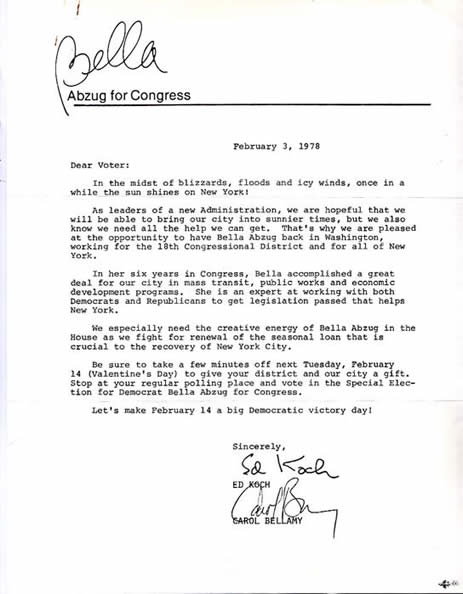 Enjoy these campaign materials from Bella's race for Mayor. Above, in the crush of campaigning along the sidewalk, Bella is accompanied by her daughter Liz now head of Liz Abzug Consulting Services and the Bella Abzug Leadership Institute and behind her, in boater, Harold Holzer, who became a renowned Shakespeare scholar and Metropolitan Museum Vice-President.