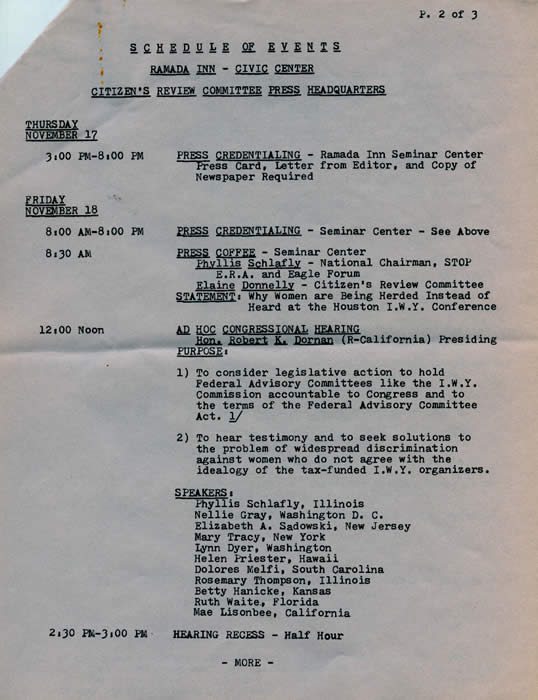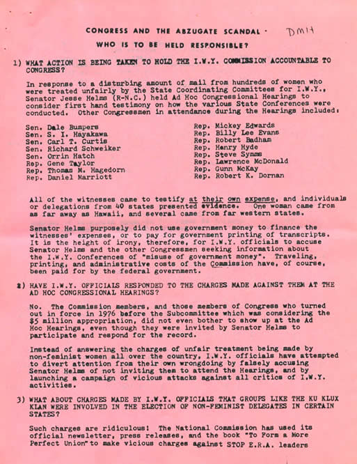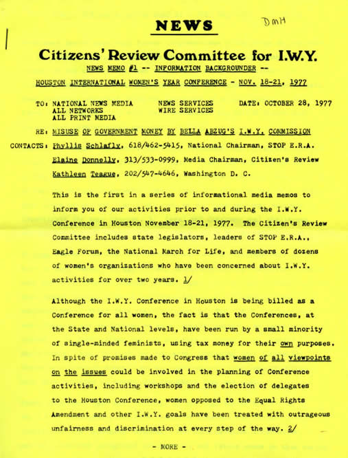 Diana Mara Henry kept ephemera of the events she photographed, as here, Phyllis Schlafly's press conference at the time of the First National Women's Conference in Houston, 1977 and the materials Schlafly produced opposing the ERA, IWY, and BElla Abzug - "ABZUGATE".