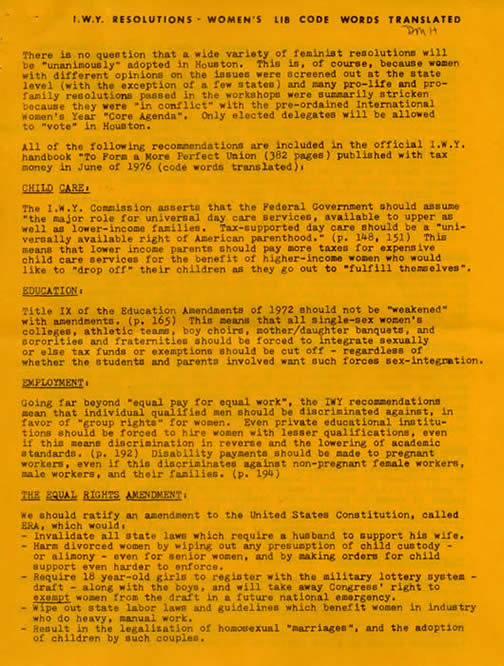 "At its first meeting chaired by former Congresswoman Bella Abzug (April, 1977) the National I.W.Y. Commission voted to urge state I.W.Y. Conferences to add lesbianism and prostitution to heir discussion agendas, as requested by I.W.Y. Commission member Jean O'Leary, who is Co-Executive Director of the National Gay Task Force." Jean O'Leary is at right, below.