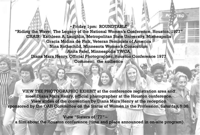 DMH Spotlight "The Legacy of the First National Women's Conference" at the Organization of American Historians Centennial meeting - remarks by Diana MAra Henry for the Rountable. Back