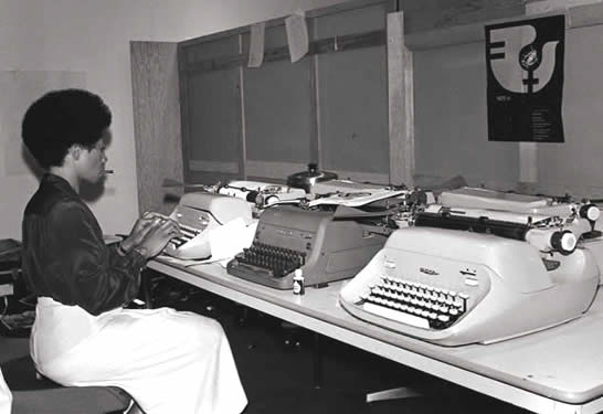 Melba Tolliver, photographed by Diana Mara Henry,in 1977 filing her story from the press room at the NY State Women's Meeting (and seen here in 2012 at the 35th Anniversary celebration of the First National Women's Conference and Diana Mara Henry's photographs as official photographer at both events)...