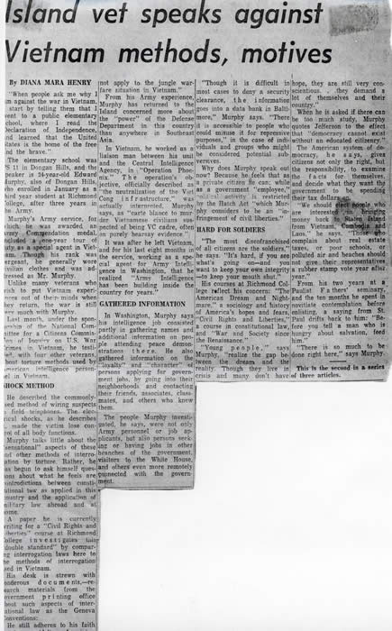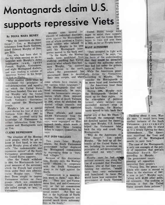 DMH Spotlight - Ed Murphy "On the Road to Dien Bien Phu...an Ecological Essay" - and more reportage for the Staten Island Advance about Ed Murphy by Diana Mara Henry, general assignment reporter, 1970. Back