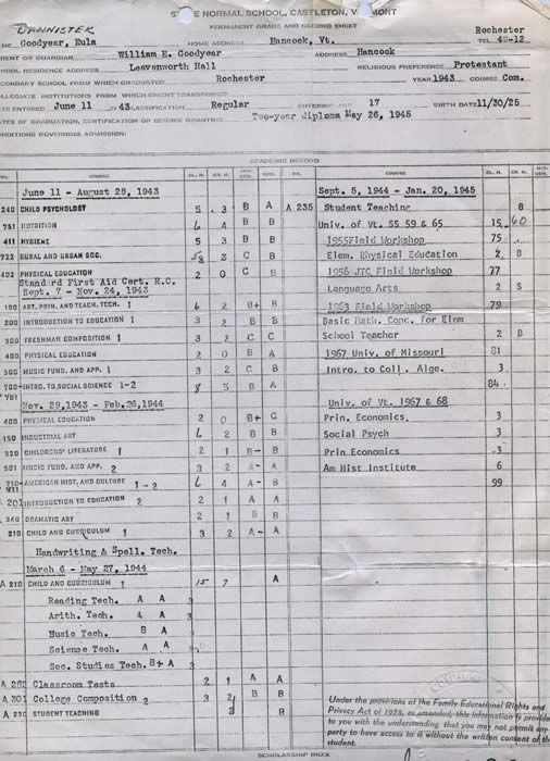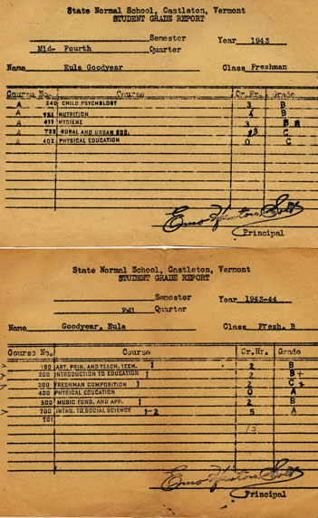 Some of Eula Bannister's grade reports from the State Normal School, Castleton.