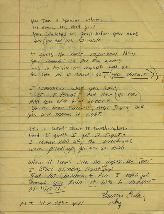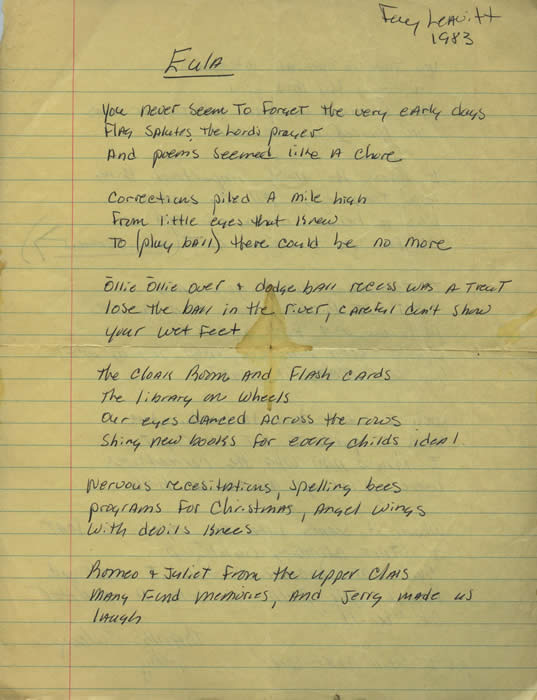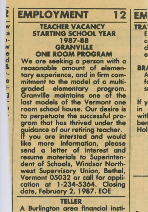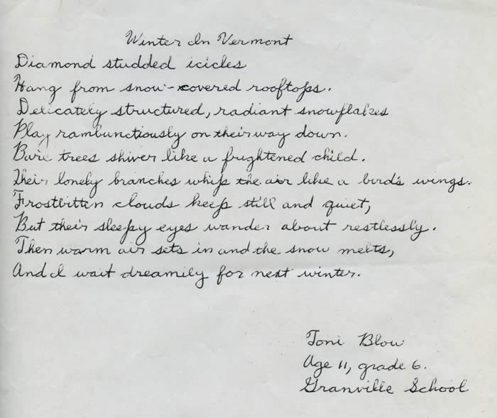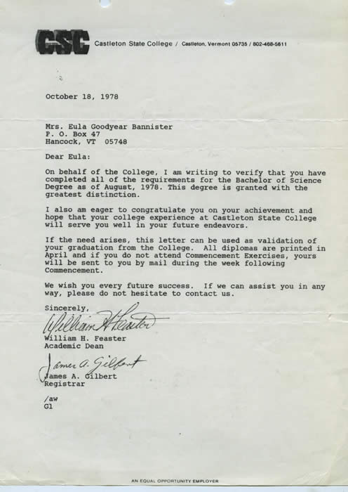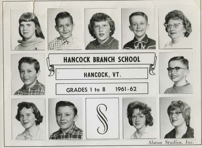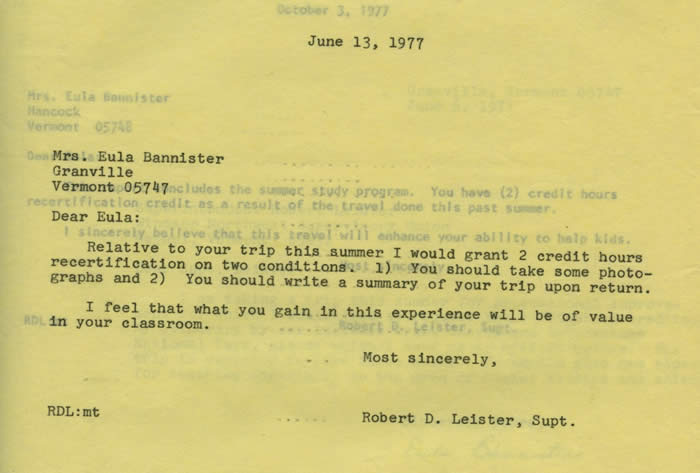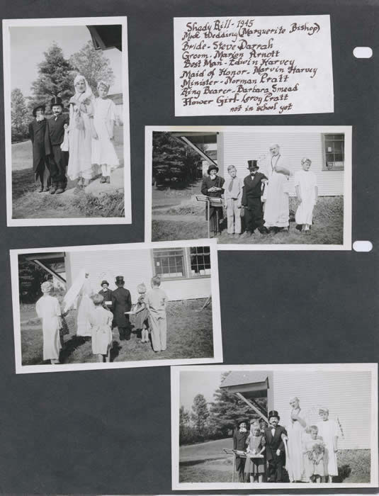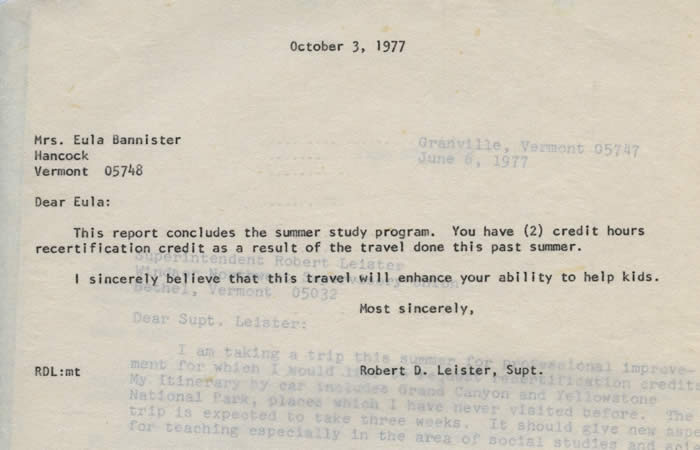 In these years looking back on a lifetime of photography, one of the greatest pleasures and rewards is reconnecting with the people photographed. The most recent highlight and sure to remain one of the most outstanding re-encounters has been with Mrs. Richard - Eula- Bannister in Hancock, VT. While we look for an archive for her legacy of remarkable document collection, some of its highlights are presented here. Please email us for more information on how to contact Mrs. Bannister with possiblities for the collection. Please enjoy the following scrapbook, including a love-story, a crush, a dress-up mock wedding, transcripts, evaluations, contracts, certificates, credits Eula accrued for a cross-country trip and a trip to ENgland, and Jessica Demers' writings at age 7 and again for her college entrance essay about the one-room school...