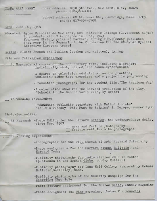 DMH Spotlight  Diana Mara Henry's first resume, senior year at Radcliffe/Harvard Back