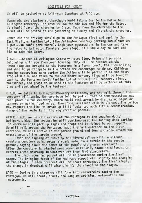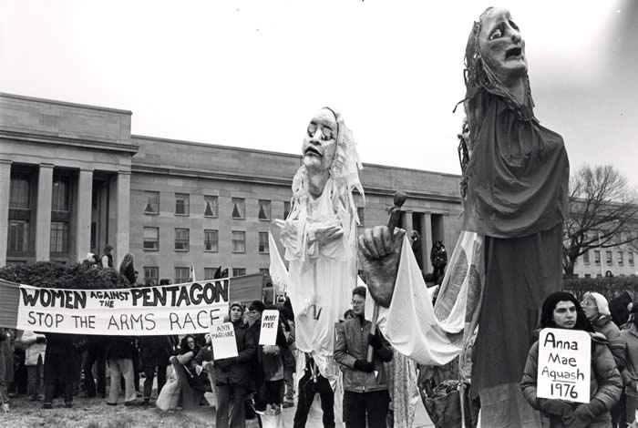 "As the women approached the Pentagon they were joined by drummers and by four women carrying large puppets in the form of women, each symbolizing a different stage of the demonstration: one was in black, for mourning; another figure in red, for rage; a third was yellow, for empowerment; and the fourth puppet, in white, symbolized defiance."