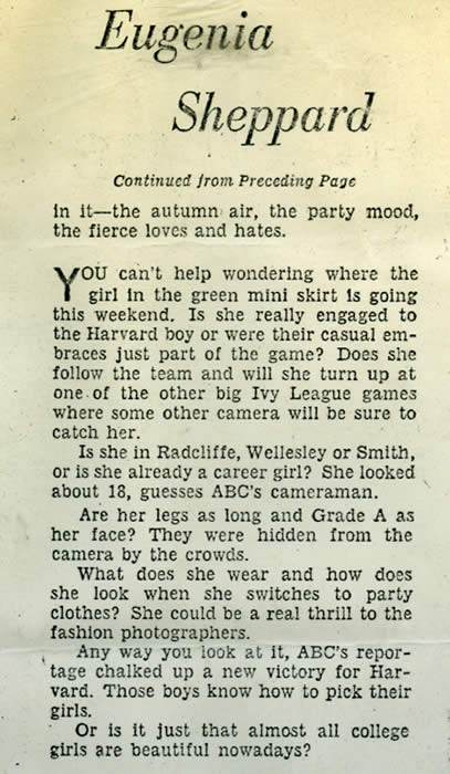 Brush with social column celebrity: “The Girl in the Green Mini” flap.