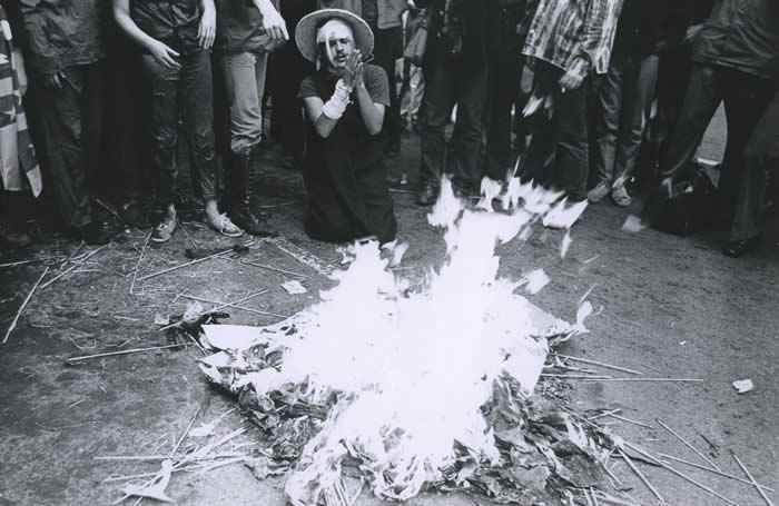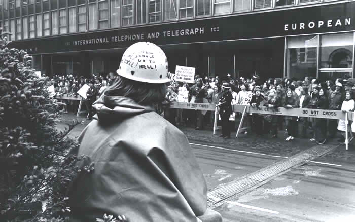 In a long line of demonstrations photographed by Diana Mara Henry of the anti-war movement, 1968-1981. This street thater took place in from of the ITT building, implicated for its production of weapons used in the illicit invasion.