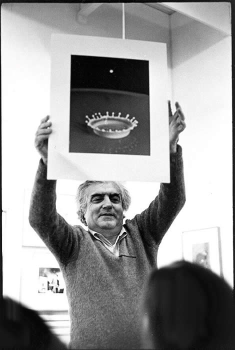 Cornell Capa displays Harold Edgerton's famous image during Edgerton's presentation at the International Center of Photography.
