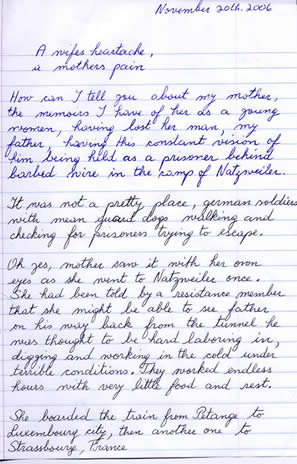 "I received an email from my sister Georgette today, and she has some input as to the biography and the dangerous feats my father and his resistance comrades did to upset the progress of the German armies.... I also have a very touching letter written to my mother from another prisoner when my father was in the camp of Hinzert. I believe that my father was unable to write at the time, maybe because of illness, and it read that my mother should destroy the letter after reading it, but she didn't. I will make copies and send it to you, it is rather interesting. I will get to busy and get my pen working to write our fathers story, and I have hopes that it will affect some people interested in works of the resistance. I will write again soon. Jeanne"