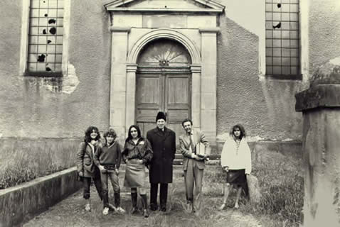 In 1985, the Bouxwiller synagogue had fallen into grave disrepair. Gilbert Weil, holding plans, is the native-born architect who later restored it and created a magnificent jewel of a museum of the Jewish Heritage in Alsace (Musée judéo-alsacien) that can be visited today and on Facebook!. Carl Henry, an early supporter of the project, is smiling next to him, and a gaggle of local girls joined to have their picture taken...