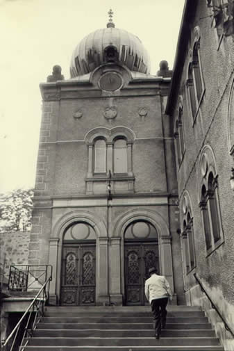 Roger leading the way up the steps to the Ingwiller synagogue, where he kept the lights on.