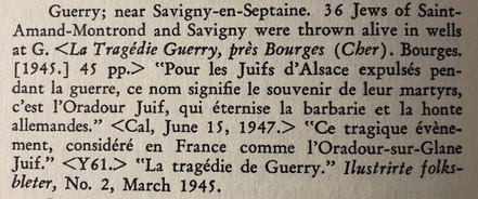 Above, from page 174 of the Analytical Franco-Jewish Gazeteer 1939-1945 with an Introduction to Some Problems in Writing the History of the Jews of France During World War II by Zosa Szajkowski. NY, NY 1966. [Under heading of Department of the Cher] "For the Jews of Alsace expelled during the war, this name signifies the memory of their martyrs, it is the Jewish Oradour, that eternalizes German barbarism and shame."
