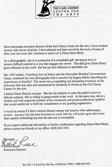 Vanishing Jews of AlsaceThis exhibit was shown at the Carl Cherry Center for the Arts in Carmel, CA. Its Executive Director, Robert Reese, writes: "I have worked closely with scores of artists. I have admired and been moved by the work of many of them, but on artist who continues to stand out is Diana Mara Henry. As a photographer, she is in possession of a remarkable gift: she knows how to present difficult material in a way that engages the viewer. That skill gives Diana great influence in the world. She has put that influence to admirable use. I admire Diana Henry's courage. She has the audacity to open the public's mind on delicate subjects. She is willing to grasp nettles in her work..."