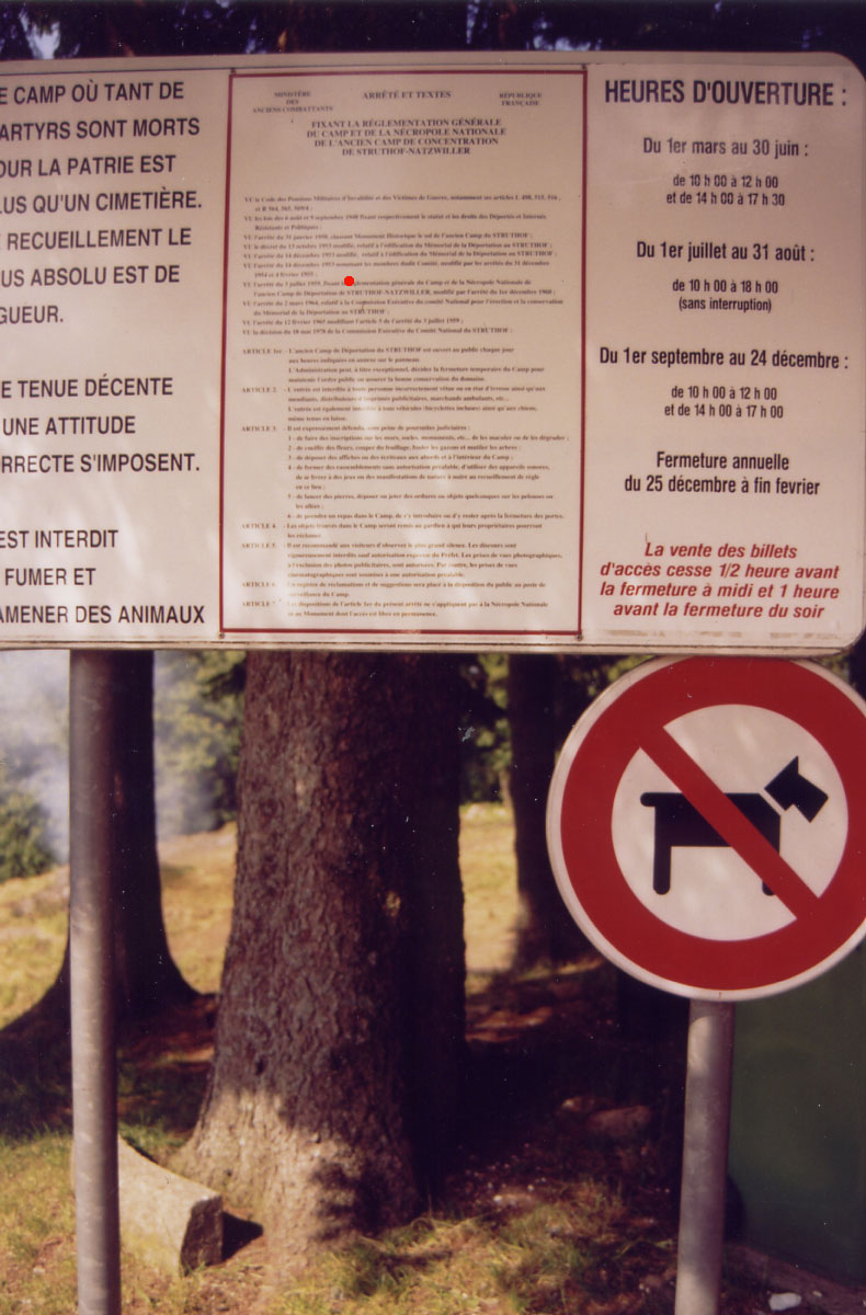 "This camp where so many martyrs died for the homeland is more than a cemetery. Absolutely dignified behavior is a must. Decent dress and a respectful attitude are a necessity. It is forbidden to smoke and to bring animals." (left panel) On the right panel are listed the hours when this French National Monument historic site is open, and in the middle are the statutes governing the management of the camp by the French government. Photo and text Copyright Diana Mara Henry.