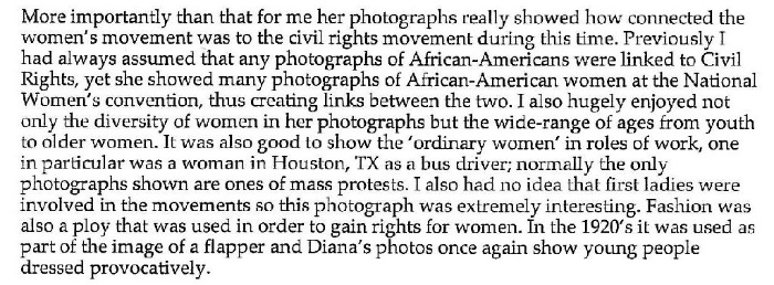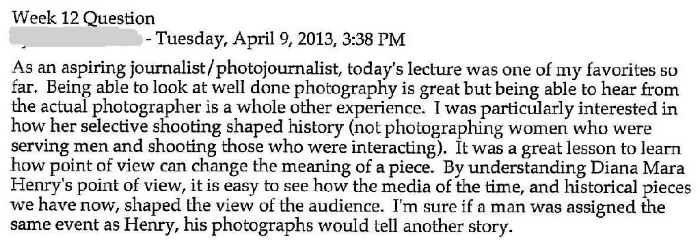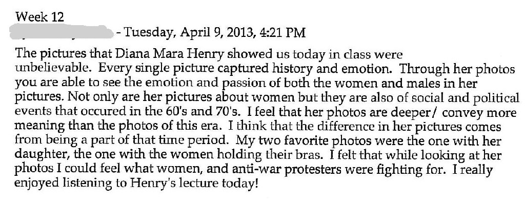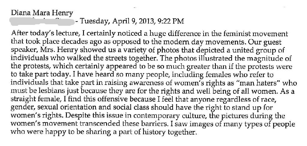 Professor Laura Lovett of U Mass Amherst invited Diana Mara Henry to give an illustrated lecture to her class in Women's History and assigned her students to write answer a discussion question that evening. They did great!