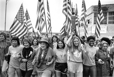 Together they raised the torch and began the last mile. Everyone in the crowd fell in behind them. I recognized Bella Abzug, IWY Commission Chair — at the head of the line in her famous oversized hat. Betty Friedan and tennis star, Billie Jean King. Liz Carpenter, former Press Secretary for Lady Bird Johnson was up ahead. We followed the flame to the doors of the Coliseum. Billie Jean King waved to the thousands women who waited at the entrance to the Convention Center. She, too, held the torch as they entered the building where thousands were waiting to greet them.